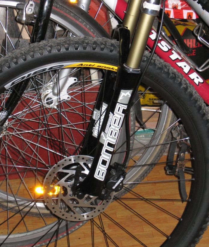 Kuva maastopyörän etuhaarukan levyjarrusta. Kuva on kopioitu Wikimedia Commonsista. Kuvan ottaja: Kozuch.